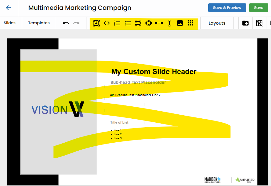 With the canvas and layout selected, dive into the creative process of designing your slide. Vision VX provides a suite of tools, including text, image, and shape manipulation features, allowing you complete control over the aesthetics and content of your custom creation.