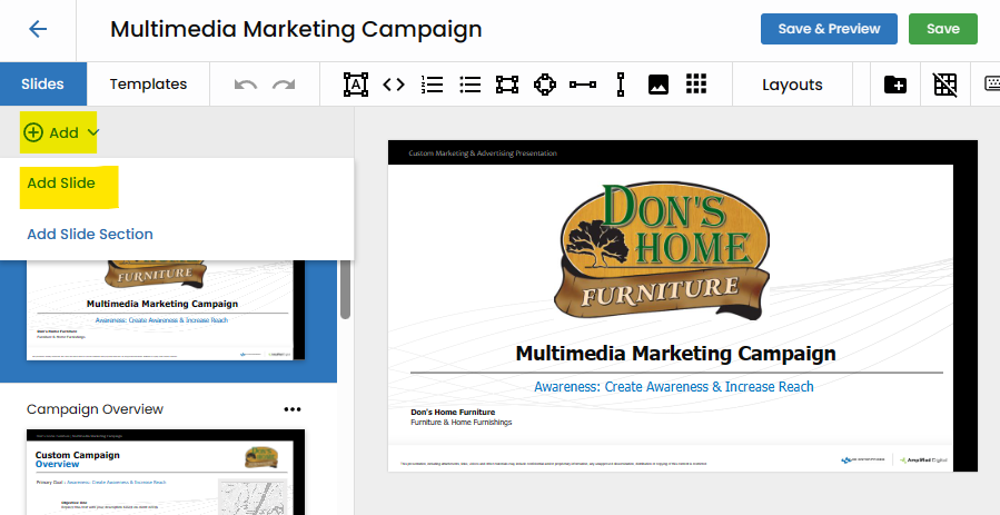 To embark on the journey of crafting a custom slide, users can click the "Add" button and then select "Add Slide." This action triggers the creation of a blank canvas, ready to be transformed into a personalized work of art.