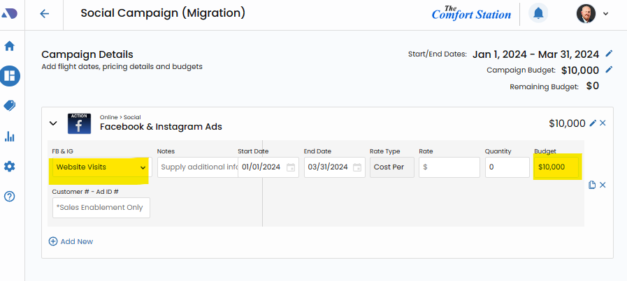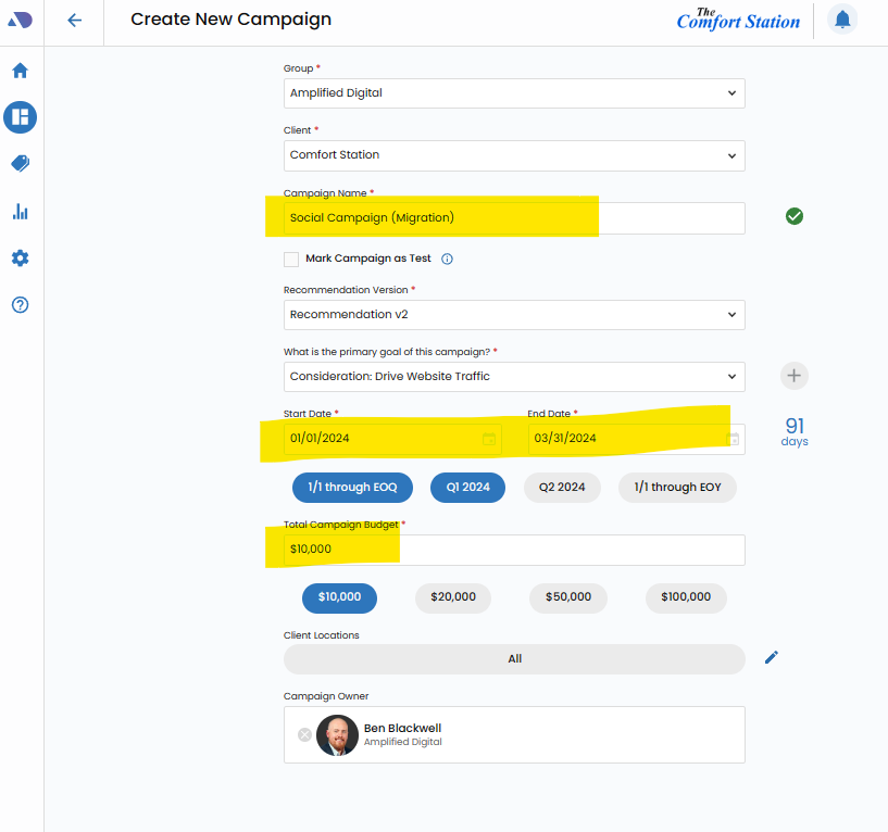 Create a campaign with the words (Migration) in the title to make it clear you're migrating an already running campaign from Vision 4.0 Be sure that the details are correct. Start and end dates, and budget.