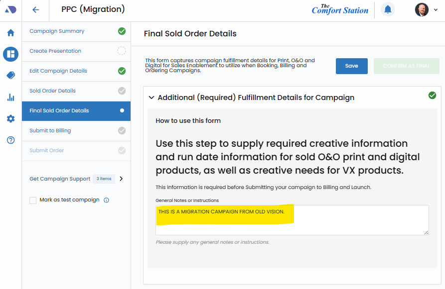 Complete the Final Sold Order details by alerting Sales Enablement that this is a migration campaign.