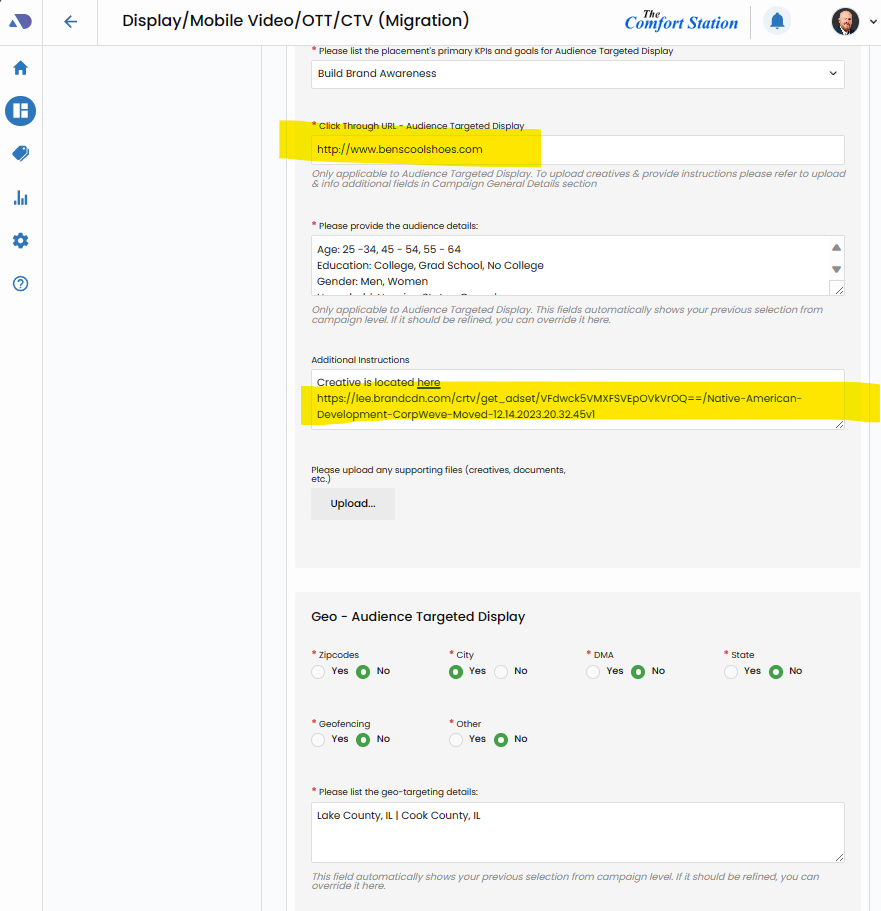 For display, video and streaming campaigns, please ensure that all targeting is correct, click-thru-urls are correct and give a link to where the team can download creative.