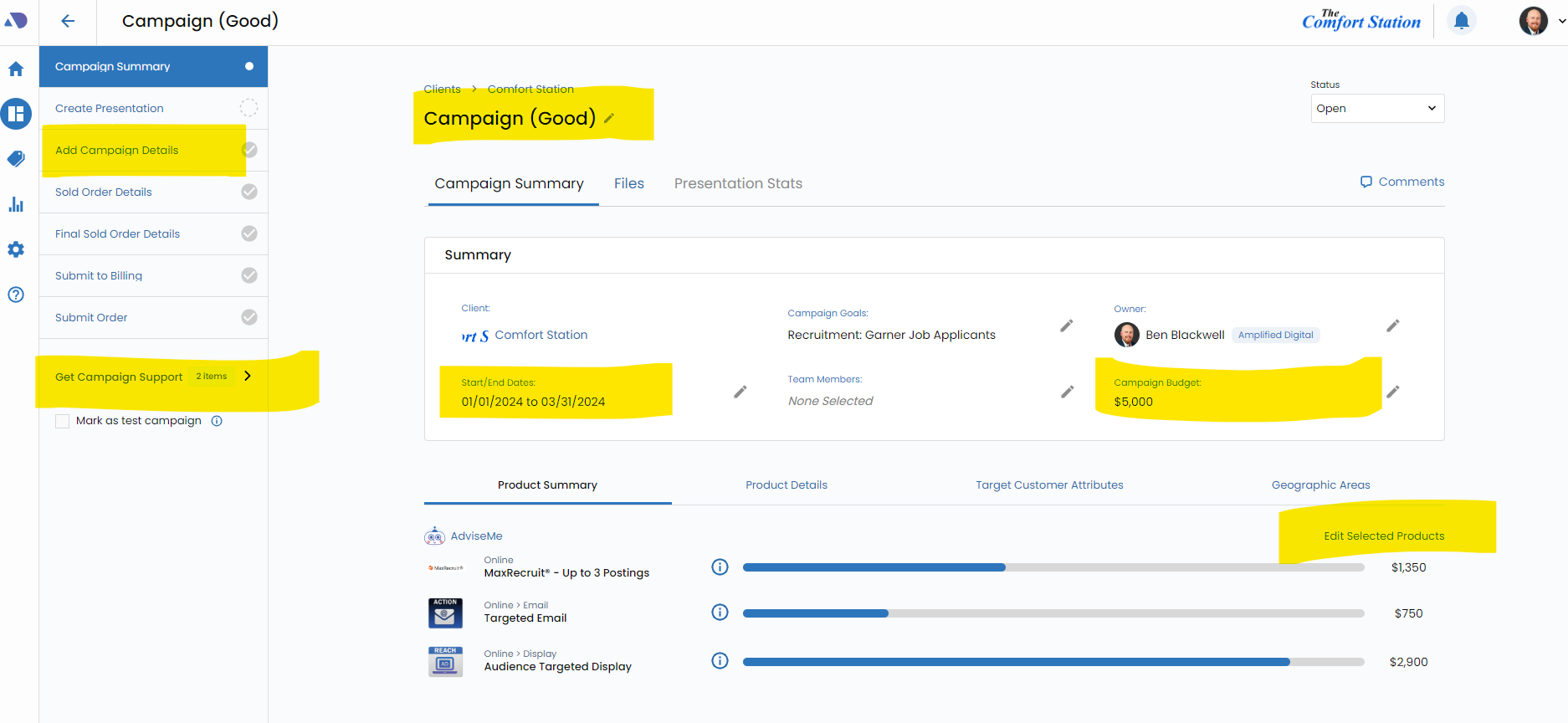 Create a campaign that reflects your Best options. Include all the products you want and the Campaign Support to get estimates and avails.