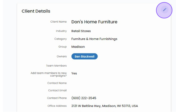 Within the client details box, locate and click on the pencil icon. This action opens the client details for editing.